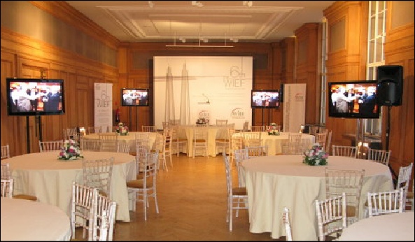 The plasmas come on high quality sturdy stands so can be located almost anywhere and come in a range of sizes. The projection screens are more suited for larger venues and where the lighting can be dimmed.